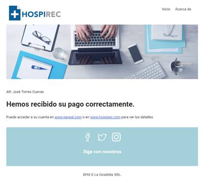 Después de que se hace el pago, se envía una notificación por correo y una página que te notifica que se ha recibido el pago.